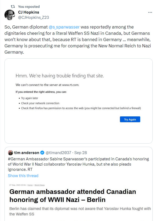 Oh, yeah, and speaking of the Germans, as it turns out, the German ambassador to Canada was among the crowd of dignitaries enthusiastically honoring a Nazi. Of course, the German public won't be aware of that, as the German media will not report it, and RT, which did, is banned in Germany.