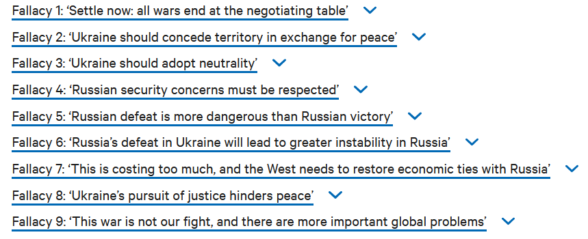 The report is organised as a list of nine "fallacies" which the authors are concerned that Russian propagandists have successfully insinuated into Western thinking, and sets out to refute each of them.