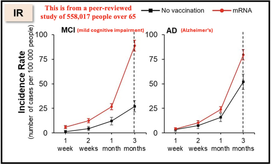 Around the same time (three weeks ago) another article was published in a mainstream journal (or to be more exact "accepted for publication"). It analyzed individuals over 65 and found COVID vaccination increased the risk of mild cognitive impairment 138% and the risk of Alzheimer's by 23%, and a smaller increase in vascular dementia and Parkinson's disease the authors did not deem to be significant.