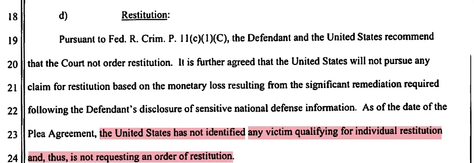 Le gouvernement des États-Unis n'a pas voulu ou n'a pas pu identifier de «victime» des fuites publiées, et les procureurs n'ont pas demandé à Assange de verser un dédommagement pour les préjudices allégués.