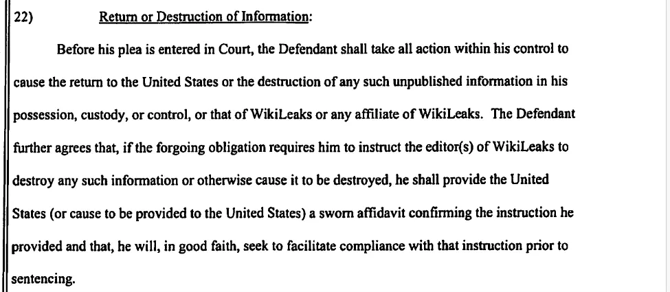 Avant que le plaidoyer de culpabilité de Julian Assange ne soit enregistré au tribunal, l'accord conclu avec le gouvernement américain exigeait qu'il «prenne toutes les mesures à sa portée pour garantir la restitution aux États-Unis ou la destruction de toute information non publiée en sa possession, sous sa garde ou sous son contrôle, ou sous celui de WikiLeaks ou de toute société affiliée à WikiLeaks».