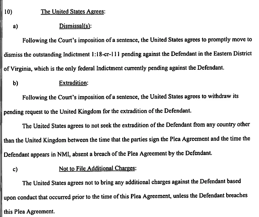 «Les États-Unis s'engagent à ne pas intenter de poursuites supplémentaires contre le défendeur sur la base d'un comportement antérieur à cet accord de plaidoyer» précise l'accord, «à moins que le défendeur ne viole cet accord de plaidoyer».