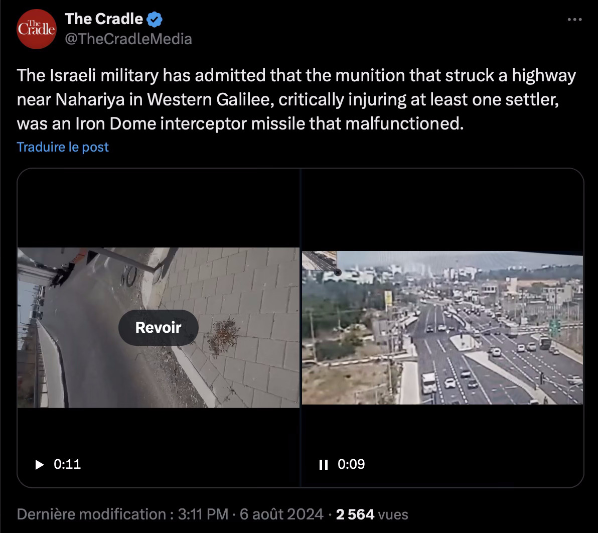 L'armée israélienne a admis que la munition qui a frappé une autoroute près de Nahariya en Galilée occidentale, blessant grièvement au moins un colon, était un missile intercepteur Iron Dome israélien qui a mal fonctionné.