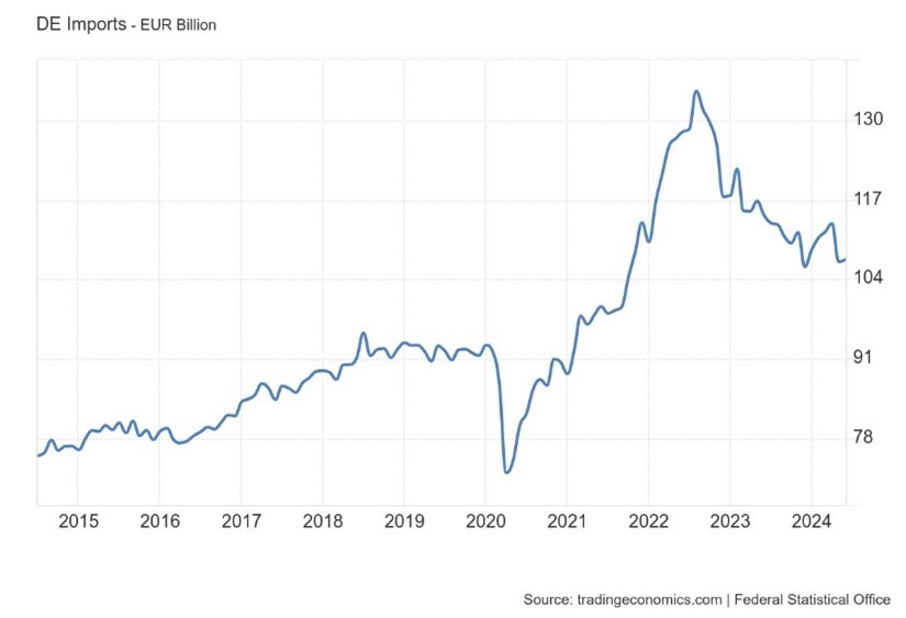 Las exportaciones de mercancías están más o menos estancadas; son las importaciones las que cayeron tras la pandemia, ya que los fabricantes alemanes recortaron la producción y el uso de materias primas y componentes.