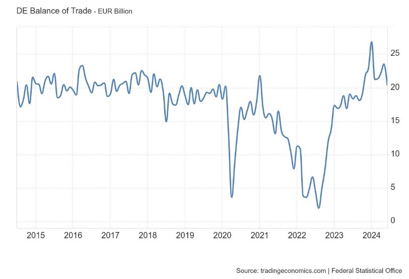 Además, en consecuencia, Alemania no está «inundando» el mundo con sus exportaciones. El superávit comercial con el resto del mundo se mantiene prácticamente invariable en 20.000 millones de euros anuales, como en los años de la década de 2010.