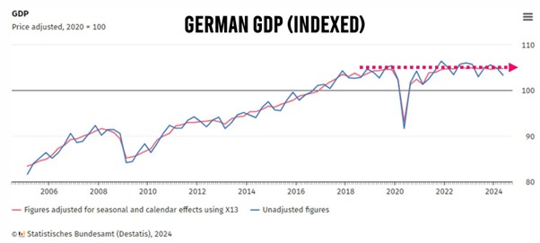 Pero esta mayor economía de Europa está en recesión. El PIB real del segundo trimestre de 2024 bajó un 0,1% en comparación con el primer trimestre de 2024 y la misma cantidad en comparación con el segundo trimestre de 2023. De hecho, el PIB real alemán no ha registrado crecimiento durante cinco trimestres consecutivos y se ha estancado realmente en los últimos cuatro años.