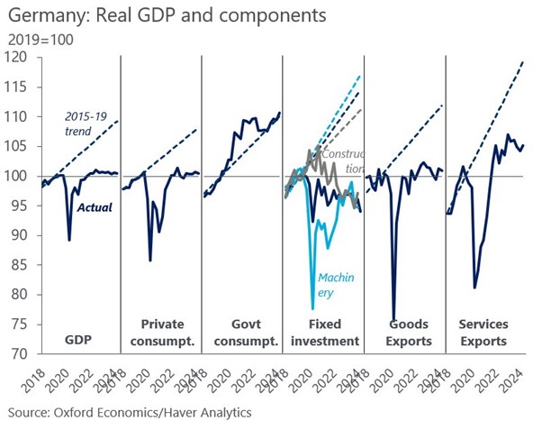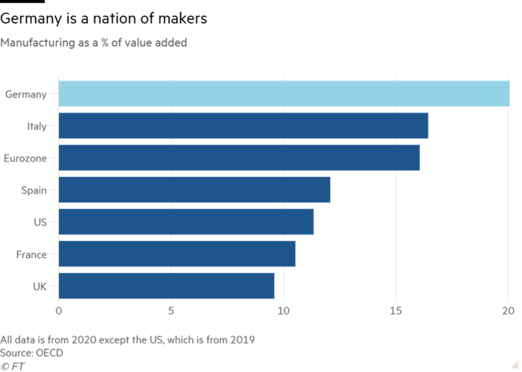 Pero por debajo está el deterioro de la economía alemana, que afecta especialmente al este. Alemania es el estado más poblado de la UE y su potencia económica, con más del 20% del PIB del bloque. La industria manufacturera sigue representando el 23% de la economía alemana, frente al 12% de EEUU y el 10% del Reino Unido. Y la industria manufacturera emplea al 19% de la mano de obra alemana, frente al 10% en EE.UU. y el 9% en el Reino Unido.