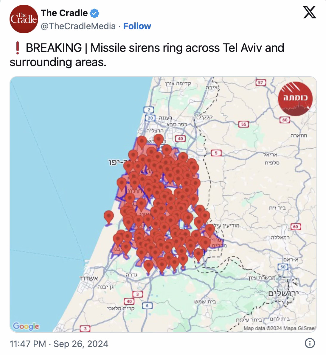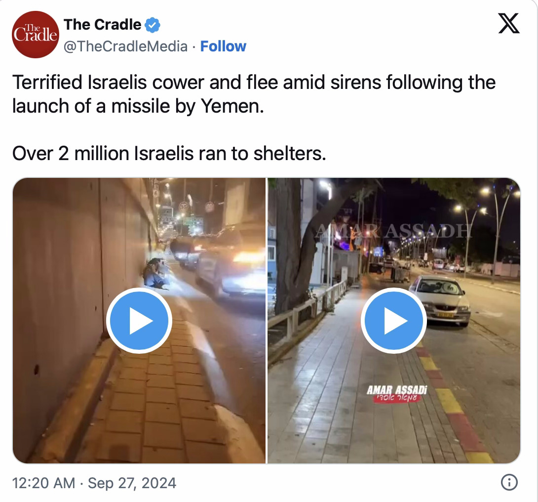 Le Yémen a tiré son deuxième missile balistique sur Tel-Aviv tôt le 27 septembre, provoquant une panique générale parmi les colons et forçant au moins deux millions d'entre eux à se réfugier dans des abris.