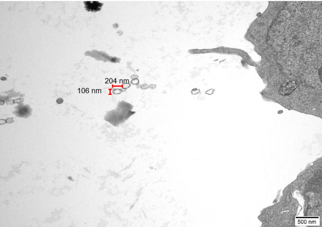 Regardez la particule à gauche de l'annotation « 106 ». Elle pourrait facilement être référencée avec l'apparence et la taille exactes d'un Exosome OU d'une particule « Sars-Cov-2 ».