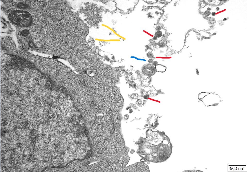 Sur cette image, on voit clairement de nombreux « débris » autour de la membrane cellulaire. La particule « Sars-Cov-2 », identifiée avec certitude, apparaît en bleu. Nous pourrions également choisir n'importe laquelle des particules surlignées en rouge comme « VIH », car elles correspondent toutes exactement à la taille, à la forme et à l'inclusion de protéines. Nous voyons également des « VEC » qui sont vides.