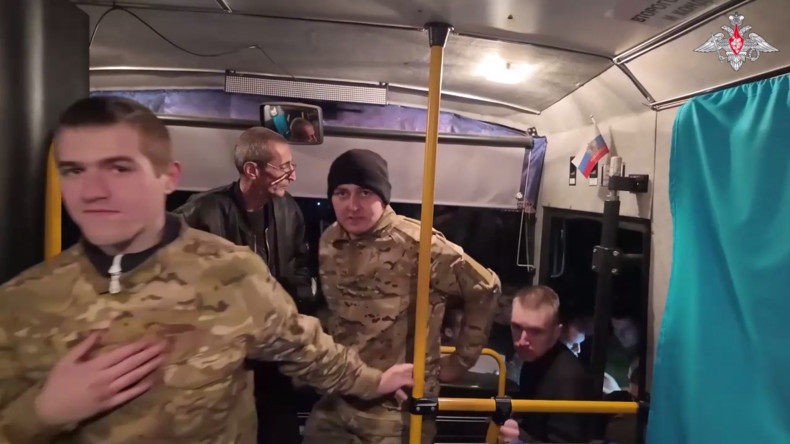 Des militaires russes, libérés dans le cadre d'un échange de prisonniers, montent à bord des bus devant les ramener en Russie.