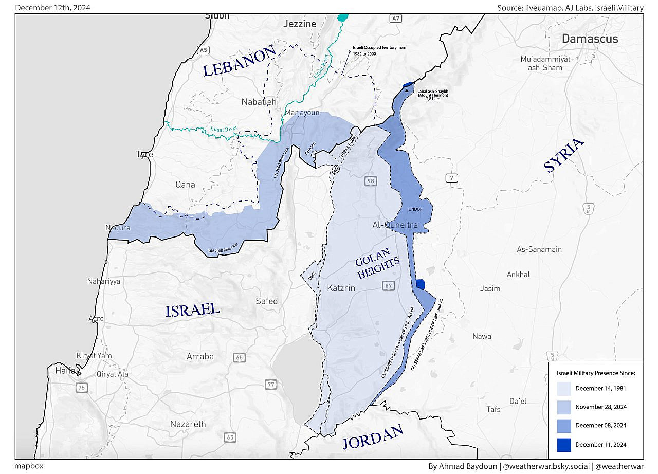 Carte montrant l'expansion militaire israélienne au Liban et en Syrie, le bleu plus foncé indiquant les avancées les plus récentes, créée à partir de données d'imagerie satellitaire, de géolocalisation et de déclarations militaires israéliennes. (Ahmad Baydoun)