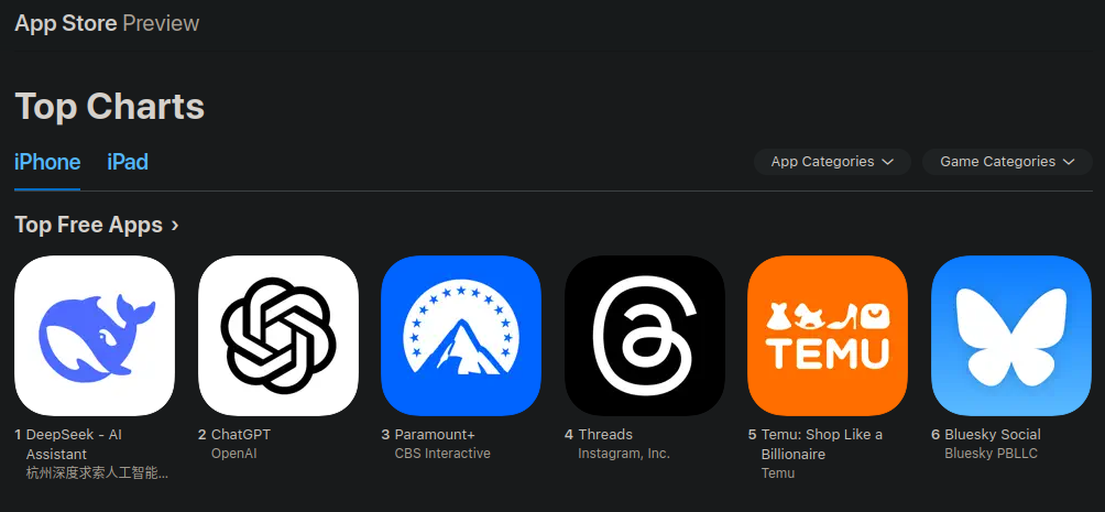 El 27 de enero Deepseek aparecía como la app más descargada en la Apple Store (Foto: Apple Store)