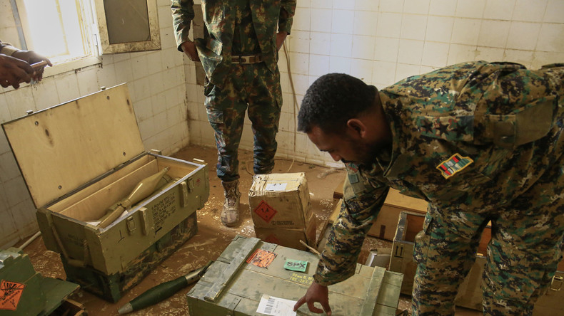 Des officiers de l'armée soudanaise inspectent un site de stockage d'armes récemment découvert, appartenant aux Forces de soutien rapide (FSR), à Khartoum, au Soudan, le samedi 3 mai 2025.