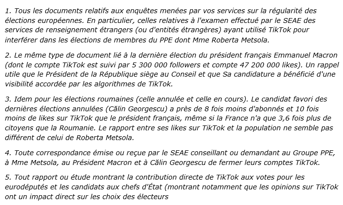 Cette controverse fait écho à l'annulation de l'élection de novembre 2024, lorsque la victoire de Calin Georgescu avait été invalidée pour ingérence russe présumée, notamment via une campagne massive sur TikTok impliquant 25 000 comptes coordonnés. Bien que des mesures aient été prises pour limiter l'ingérence étrangère dans ce scrutin, comme une coopération renforcée avec TikTok, le problème des « morts votants » suggère des failles internes persistantes. L'absence de transparence du gouvernement alimente la méfiance, en particulier parmi les électeurs de Simion, qui y voient la preuve d'une corruption systémique. Sans une enquête approfondie, ces allégations risquent de délégitimer le processus électoral et d'exacerber les tensions avant le second tour. Par ailleurs dans une demande, que France-Soir a pu consulter, au Service Exterieur de l'Union européenne sur d'éventuelles ingérences russes ou chinoises dans les élections. Voila les informations qui étaient demandées :