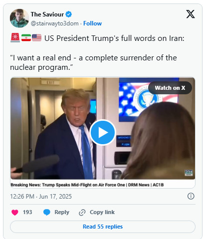 President Donald Trump is now saying he has no intention of seeking or facilitating a ceasefire with Iran, telling reporters that he's after a "complete give-up" from Iran instead.