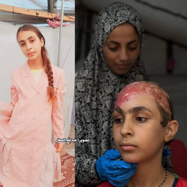 Hala Abu Dahleez, 12 ans, a été blessée alors qu'elle jouait près de sa tente pour personnes déplacées à Gaza. L'explosion lui a valu de graves blessures au cuir chevelu et elle reste à Gaza sans accès aux soins médicaux urgents dont elle a besoin, en raison du blocus israélien continu. Hala Abou Dahleez