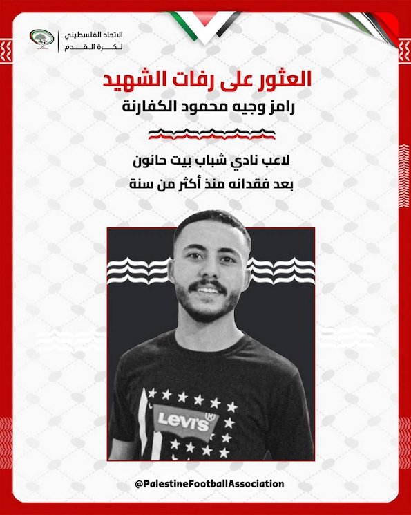 La Fédération palestinienne de football annonce avoir retrouvé les restes du footballeur Ramez Al-Kafarna, qui était défenseur au club Shabab Beit Hanoun Al-Ahli avant d'être brutalement tué par l'occupation israélienne il y a plus d'un an. Le footballeur Ramez Al-Kafarna