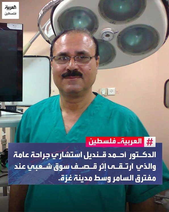Le Dr Ahmad Qandil, l'un des meilleurs chirurgiens consultants de Gaza, vient d'être tué dans un bombardement israélien sur un marché très fréquenté près du carrefour Al-Samer, dans le centre de la ville de Gaza, qui a fait de nombreux morts et blessés.