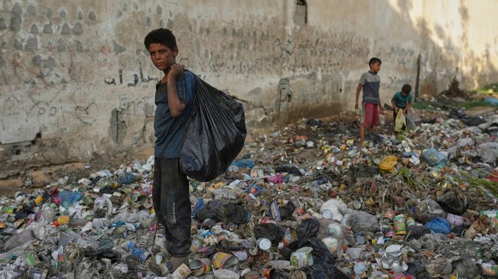 Yassin Al-Masry, 13 ans, regarde la caméra alors qu'il se tient au-dessus des ordures tout en cherchant du plastique à utiliser pour faire du feu pour cuisiner, dans la ville de Gaza, mercredi 27 août 2025. [AP Photo/Jehad Alshrafi]