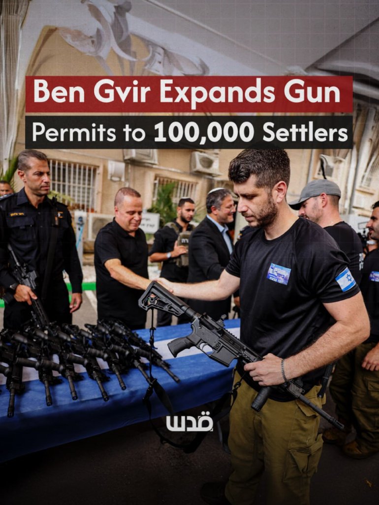 Le colon fasciste à la tête de la « sécurité » israélienne Itamar Ben Gvir a annoncé lundi la délivrance de permis de port d'armes à environ 100 000 colons supplémentaires.