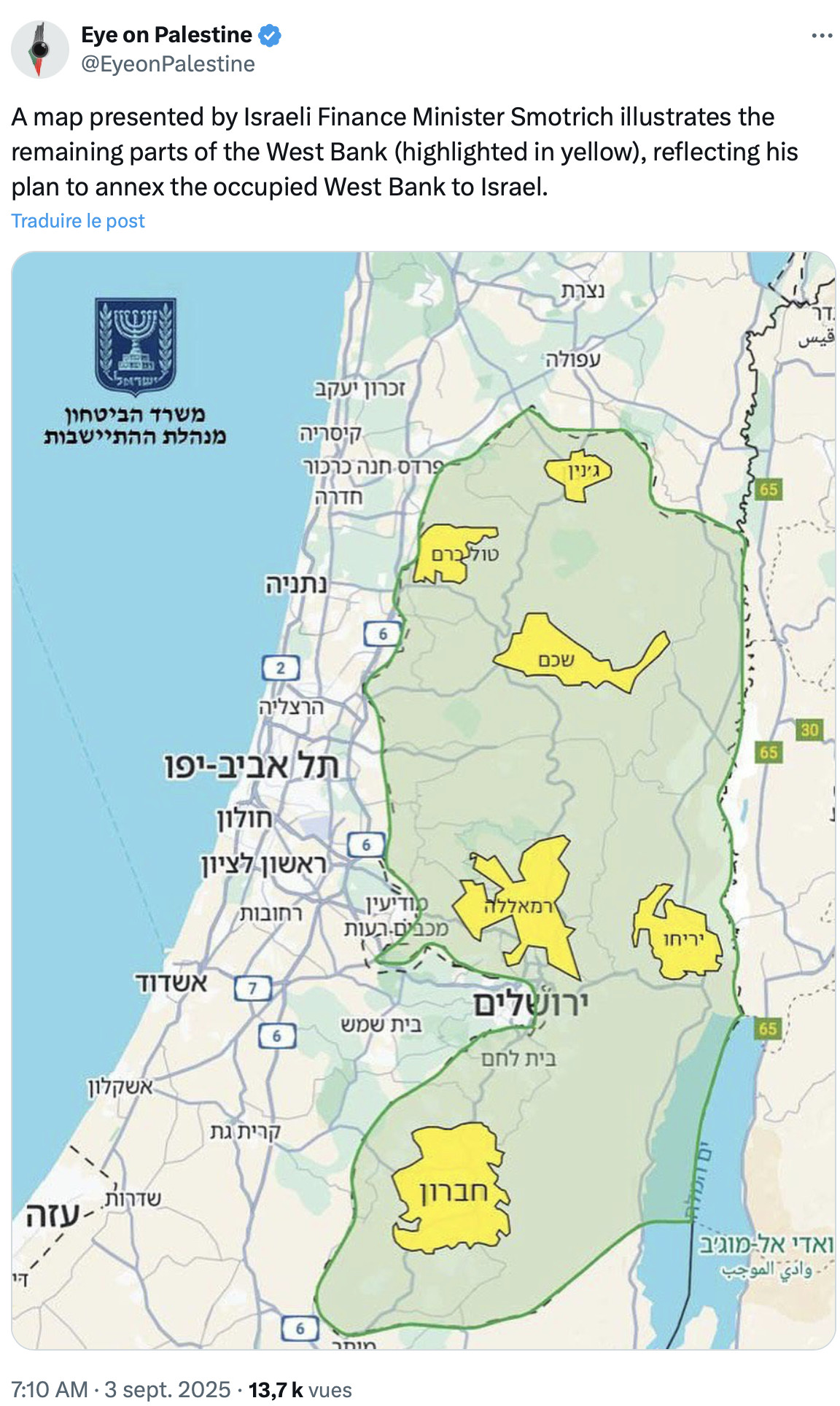 Article original en anglais : The new Israeli map proposing to annex 80% of the West Bank, explained, Mondoweiss, 4 septembre 2025Traduction : Dominique Muselet pour Chronique de Palestine