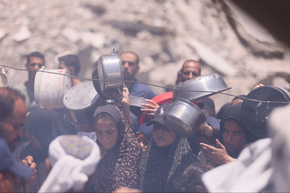 Des habitants de Gaza attendent de la nourriture dans une cuisine communautaire.
