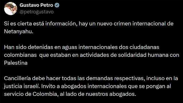 Le président Gustavo Petro Urrego a annoncé ce mercredi, par le biais de ses réseaux sociaux, une série de mesures en réponse à la détention, dans les eaux internationales, de deux citoyennes colombiennes qui réalisaient des activités de solidarité humanitaire pour la population palestinienne à Gaza, à bord de la Global Sumud Flotilla.