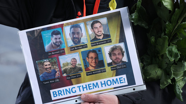 Une femme tient des photographies de citoyens allemands faisant partie des otages encore retenus par le Hamas à Gaza. [Photo d'illustration]