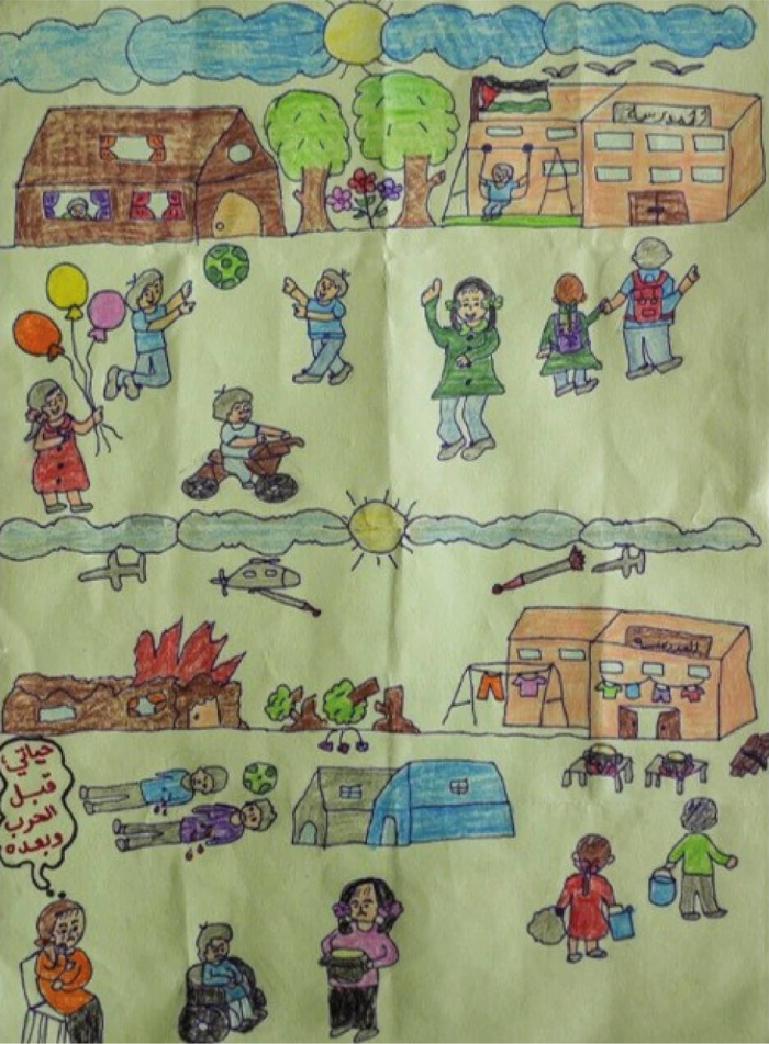 Dans la partie inférieure, qui représente « l'après-guerre », des missiles et des avions de combat volent dans le ciel grisâtre, la maison auparavant intacte est en feu, les arbres entre la maison et le bâtiment scolaire sont couchés sur le sol, touchés par ce qui semble être un quadricoptère, la cour de récréation est remplie de cordes à linge et de vêtements suspendus, les enfants qui portaient des sacs à dos transportent désormais des seaux d'eau, les garçons qui jouaient au ballon gisent maintenant sur le sol, ensanglantés ; il y a des tentes au milieu, et la fille elle-même est assise en pleurant dans la partie inférieure gauche, avec une bulle au-dessus de sa tête qui dit : « Ma vie avant et après la guerre ».