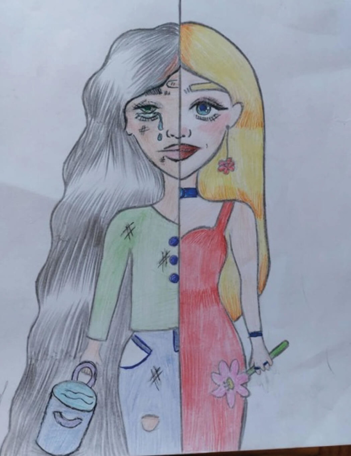 Le dessin n° 2 est l'œuvre d'une enfant un peu plus âgée, une jeune fille de quatorze ans qui a exprimé comment sa vie a changé dans un autoportrait qui montre clairement le passage d'une vision joyeuse à une vision sombre et triste.