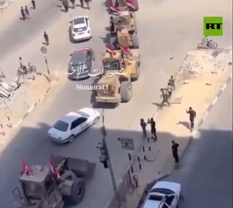 Gaza cleanup and reconstruction begins as Egypt sends a brigade of bulldozers to begin clearing rubble in Gaza, seen here entering through Rafah - credit video frame shot from Russia Today