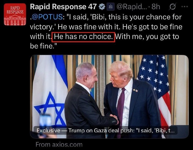 In Israel, the humiliation was palpable. Prominent commentator Nahum Barnea declared bluntly, "He's the boss," referring to Trump, (not Netanyahu). The phrase captured the new political physics where Trump could no longer be cast as a willing accomplice to Netanyahu's war machine, but a commanding authority shaping Israeli actions in real time away from the Gaza occupation and towards a solution agreed to by Hamas and Arab powers. Trump's ultimatum to Hamas on Friday and his immediate acceptance of their full compliance revealed that the war's tempo, its narrative, and even its conclusion now ran through Washington, or more precisely, through Trump himself. The above cited New York Times piece, however, inserted a fallacious caveat in-line with Zionist talking points from Netanyahu's desk itself, that Hamas had only 'partially' agreed to, or rather actually disagreed with Trump. The evidence of this point is flimsy, and is countered by Trump's direct reproduction of the letter from Hamas to Trump on his Truth social account.