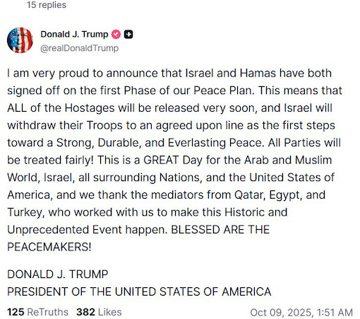 Trump qui aspire à recevoir le prix Nobel de la paix et est engagé dans une course contre la montre puisque la nomination doit être annoncée vendredi, s'est déclaré « fier qu'Israël et le Hamas aient signé la première phase du plan de paix ».