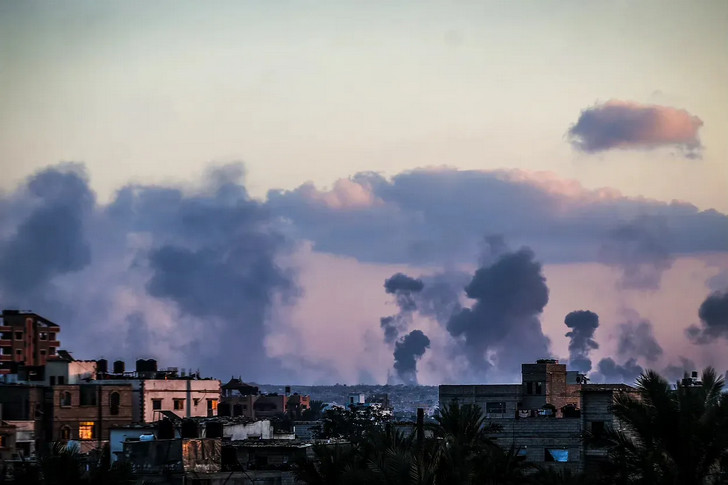 Israël a mené une série d'attaques à Gaza dimanche, malgré le cessez-le-feu. Une épaisse fumée s'élève de la partie est de Khan Yunis, à Gaza, à la suite des attaques. (Photo © Ali Jadallah/Anadolu via Getty Images)