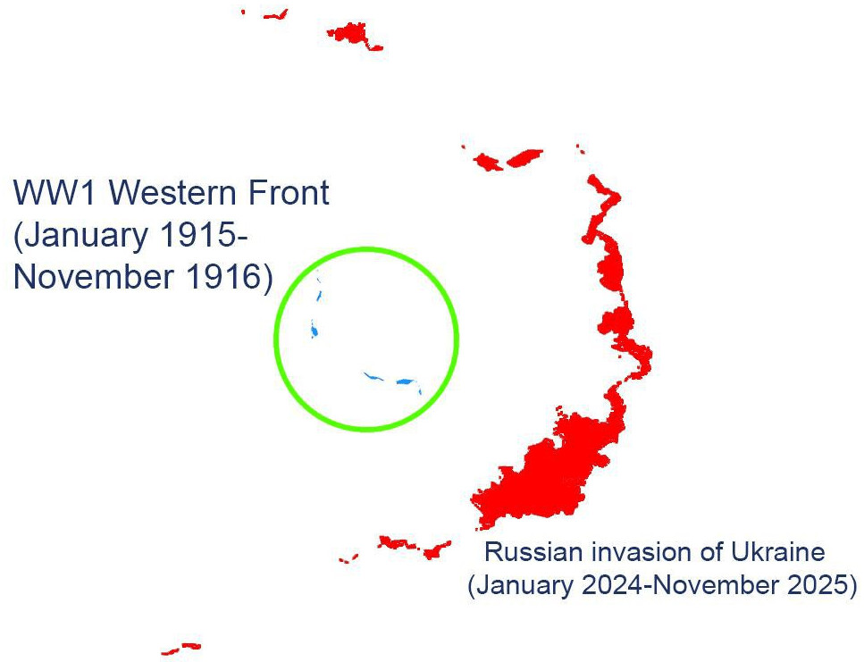 Une carte comparative intéressante des avancées de la Première Guerre mondiale sur une période de près de deux ans avec les avancées des forces russes sur la même période récente :