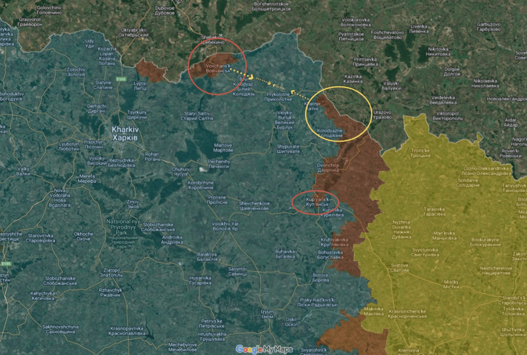 Il est à noter que la zone entourée en jaune n'a été reliée que récemment, car elle comportait auparavant deux zones d'avancée russes distinctes, qui forment désormais un front unifié. À terme, l'objectif est de relier ce front sur toute la frontière avec celui de Volchansk afin de créer une zone tampon et un tremplin pour de futures avancées vers Kharkov.