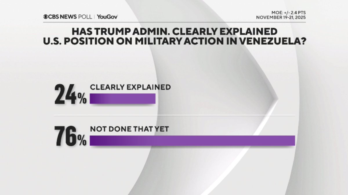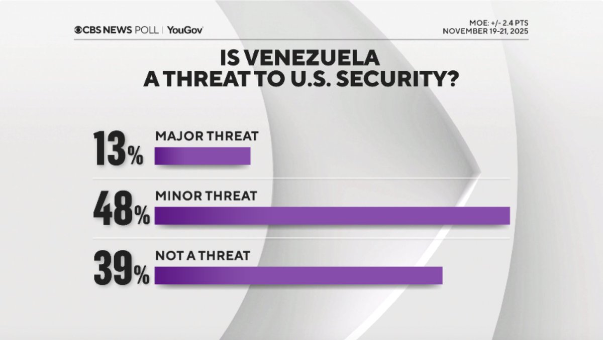 https://pbs.substack.com/profile_images/1544410511340703745/WwmjvWjo.png Max Blumenthal@MaxBlumenthal Only a tiny fraction of Americans support a regime change war on Venezuela or believe the official lie about narco trafficking, according to a new YouGov poll Rubio's Gusano Games are already discredited, and will produce ferocious backlash if they go to the next stage 3:01 PM · Nov 25, 2025 · 51.9K Vues -- 86 Réponses · 824 Reposts · 1.99K Likes