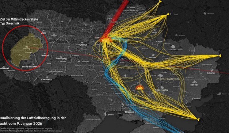Remarquez la ligne rouge, une seule ligne en direction de Lviv, qui était le lancement d'un ICBM russe «Oreshnik». Cet impact de missile isolé a ensuite déclenché un incendie dans la plus grande installation de stockage souterrain de gaz naturel de toute l'Europe ; dix-sept milliards de mètres cubes de gaz naturel brûlent désormais, de manière incontrôlable, à LVIV.