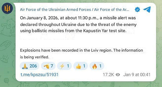 Cela étant dit, l'Oreshnik n'était qu'un élément d'une importante attaque aérienne en cours qui frappe actuellement Kiev et d'autres régions avec des Kalibers, des Kinzhals, des Iskanders, des Gerans et tout ce qui se trouve entre les deux ; il est donc possible que l'avertissement ci-dessus y fasse référence, bien qu'il fût inhabituel.