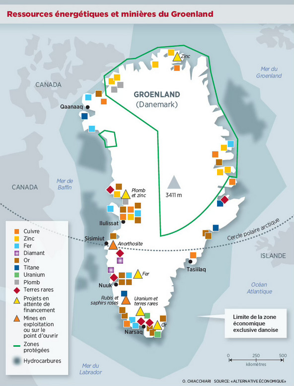 Ces dernières décennies, la fonte des calottes glaciaires du Groenland due au changement climatique a favorisé l'étude et l'exploitation de la géologie profonde du pays. Des études de faisabilité et des forages réalisés au début et au milieu des années 2010, notamment entre 2011 et 2015, ont révélé la présence de graphite, de lithium, de terres rares et d'uranium abondants dans le sol. Alors que les États-Unis s'engageaient dans une nouvelle guerre froide contre la Chine, ils ont dû chercher de nouvelles sources de terres rares, car la Chine contrôle le raffinage de ces éléments et la production d'aimants. L'île est ainsi devenue non seulement une source de minéraux, mais aussi un nœud essentiel de l'architecture de sécurité de la chaîne d'approvisionnement sous domination américaine.