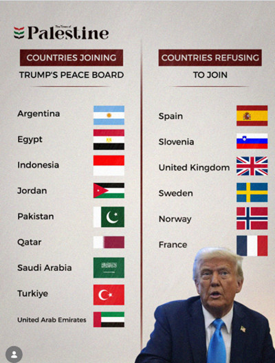 Au 21 janvier 2026 : à gauche les pays prêts à payer un milliard de dollars pour rejoindre le « Conseil de la Paix », à gauche ceux qui ont refusé. Liste non stabilisée.