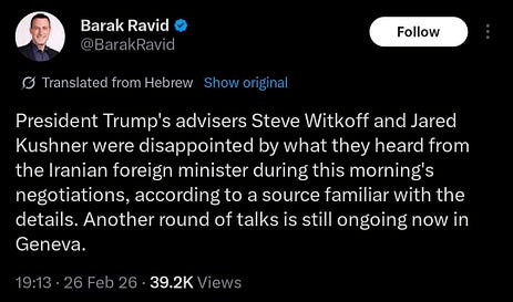 "Whitcoff et Kushner ont été déçus par la position du ministère iranien des Affaires étrangères lors des négociations qui se sont tenues aujourd'hui à Genève, selon le journaliste d'Axios, Barak Ravid.