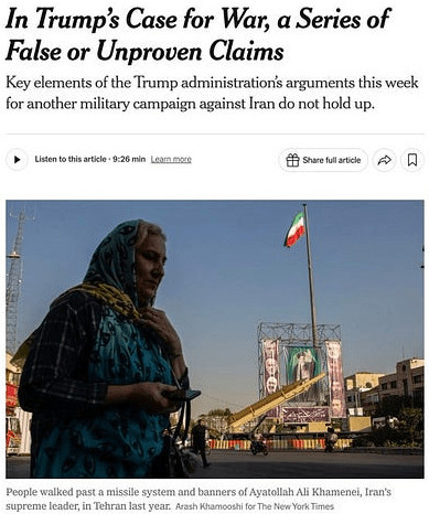 Et le NYT a de nouveau travaillé sans relâche pour réfuter les justifications de Trump en faveur de la guerre :