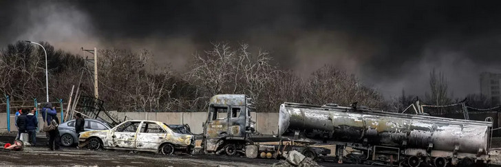 Un nuage de fumée noire recouvre les véhicules détruits près d'un incendie qui fait toujours rage après une frappe aérienne nocturne sur la raffinerie de pétrole de Shahran, au nord-ouest de Téhéran, le 8 mars 2026. (Photo © AFP via Getty Images)