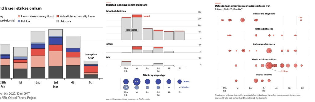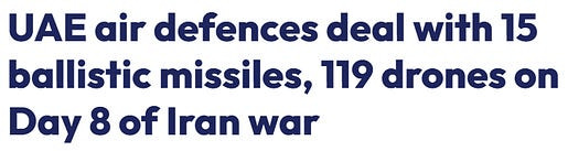 Comme on peut le constater, les Émirats arabes unis signalent à eux seuls 15 missiles balistiques et près de 120 drones tirés sur leur territoire aujourd'hui, tandis que certaines statistiques "officielles" font état d'un nombre total de tirs iraniens sensiblement équivalent, toutes directions confondues. Si cette disparité est avérée, on parle d'écarts considérables entre les statistiques "officielles" et le nombre réel de tirs.
