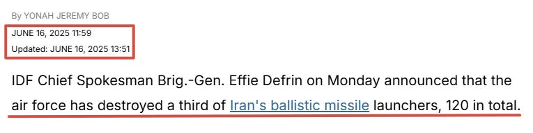 Deuxièmement, le problème avec ces récits est qu'ils sont pratiquement identiques aux salades qui nous ont été transmises lors de la précédente Guerre des Douze Jours, en juin 2025. Voici un article du Jerusalem Post daté du 16 juin 2025 :
