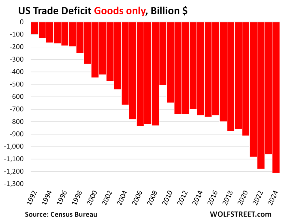 Yet for more than a half-century, that has not happened, despite our horrendous budget and trade deficits. Our accumulated national debt has reached an obviously unpayable $38 trillion, and it has recently been growing by roughly $1.8 trillion per year. Only a limited number of American products are bought by the rest of the world, while a large fraction of all our consumer goods are imported from China and other countries, so our annual trade deficit in goods has regularly topped a trillion dollars per year.