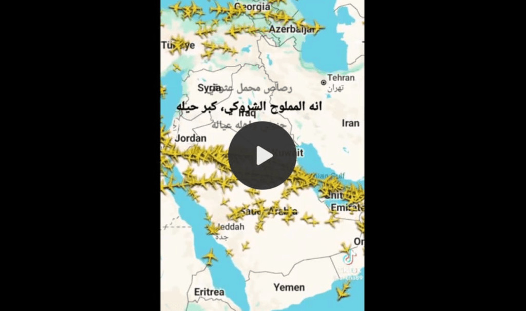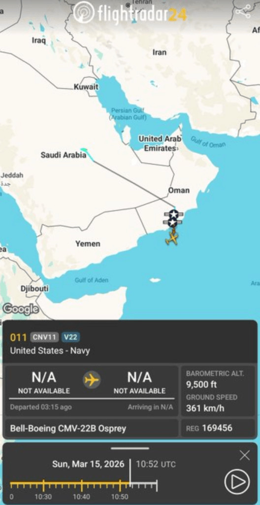 "Un intéressant CMV-22B Osprey de l'US Navy (169456) a décollé de la base aérienne Prince Sultan et a atterri au large de Salalah. Cet appareil est affecté au porte-avions USS Abraham Lincoln ; il s'agit donc probablement de sa position actuelle".