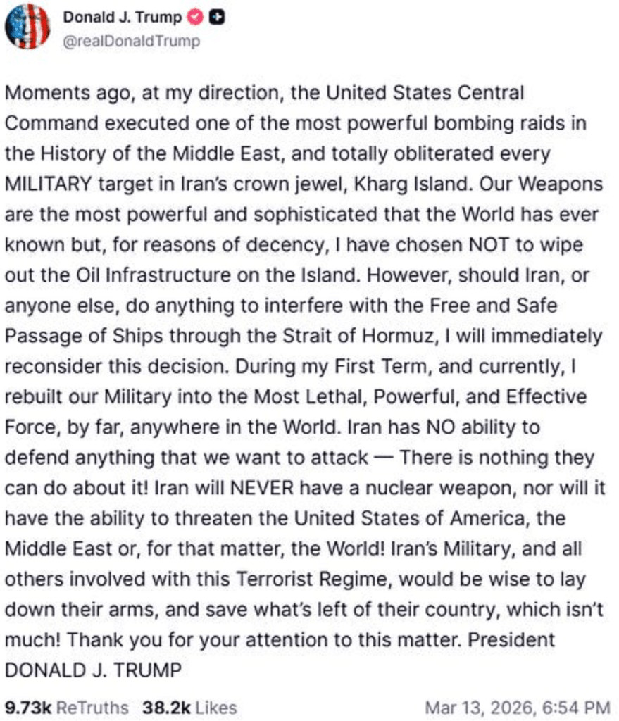 "Suite à la première frappe, Trump a déclaré que les forces américaines avaient"totalement anéanti"les cibles militaires iraniennes sur l'île, mais avaient laissé les infrastructures pétrolières intactes. Il a averti que ces installations pourraient également être visées si l'Iran perturbait le trafic maritime dans le détroit d'Ormuz.